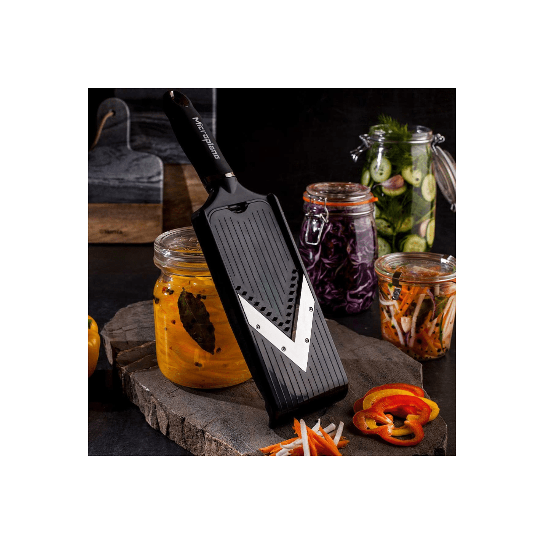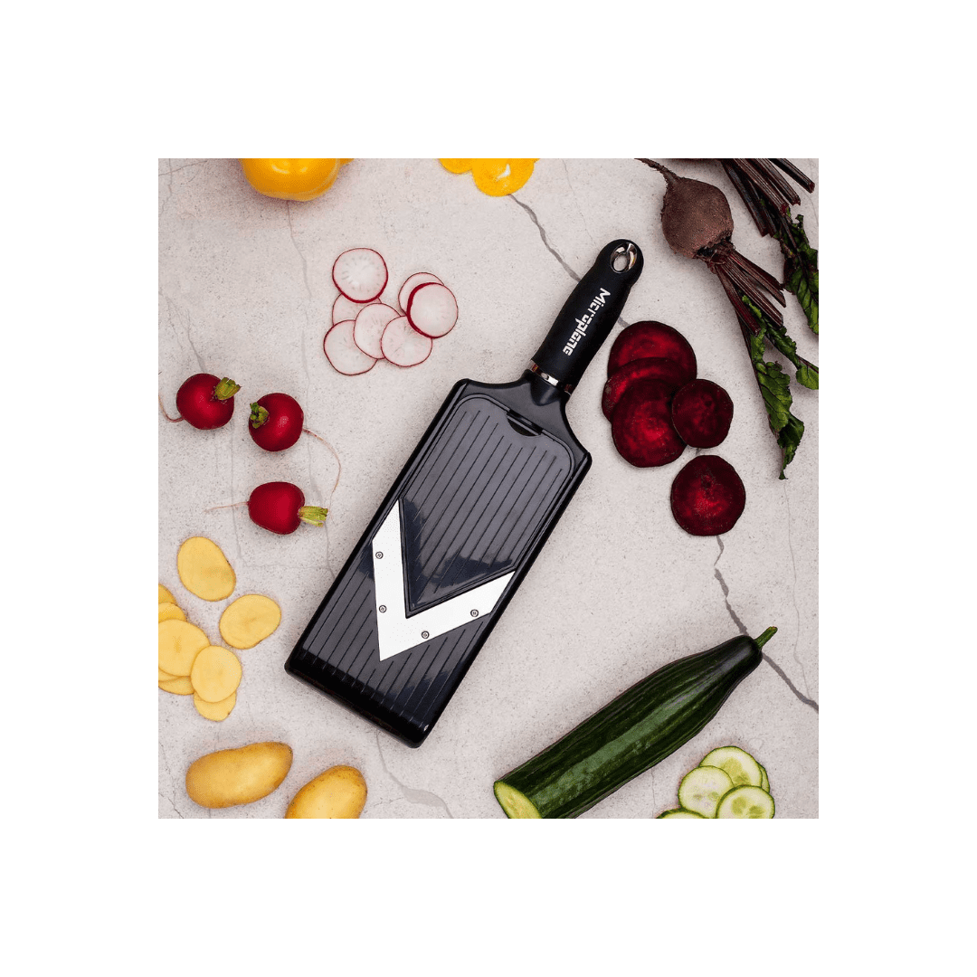 With the Adjustable V-Blade Mandoline Vegetable Slicer, you can make quick work of creating sliced or julienned vegetables. With its surgical-grade stainless-steel blade and universal hand guard included, this versatile slicer is perfect for slicing vegetables for sandwiches and burger toppings as well as salads, coleslaw, chips, poke bowls and stir fries.