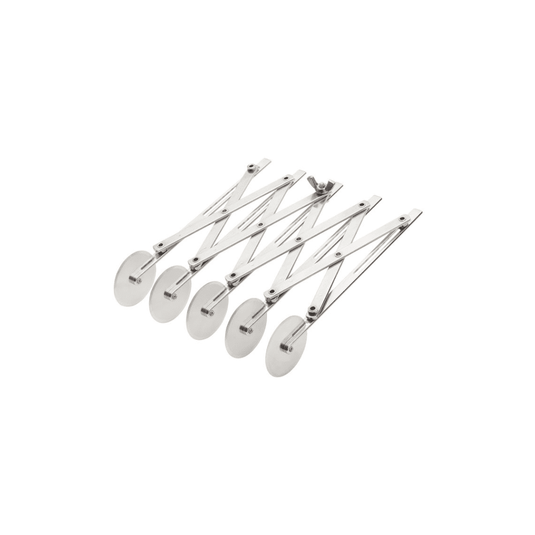 All Ateco multi-wheel cutters feature a locking device to insure even cuts and uniform portions. To use, loosen wing nut and adjust outer rods until the wheels are at the desired spacing. Then tighten wing nut. Opens to 4 .9″ between wheels.