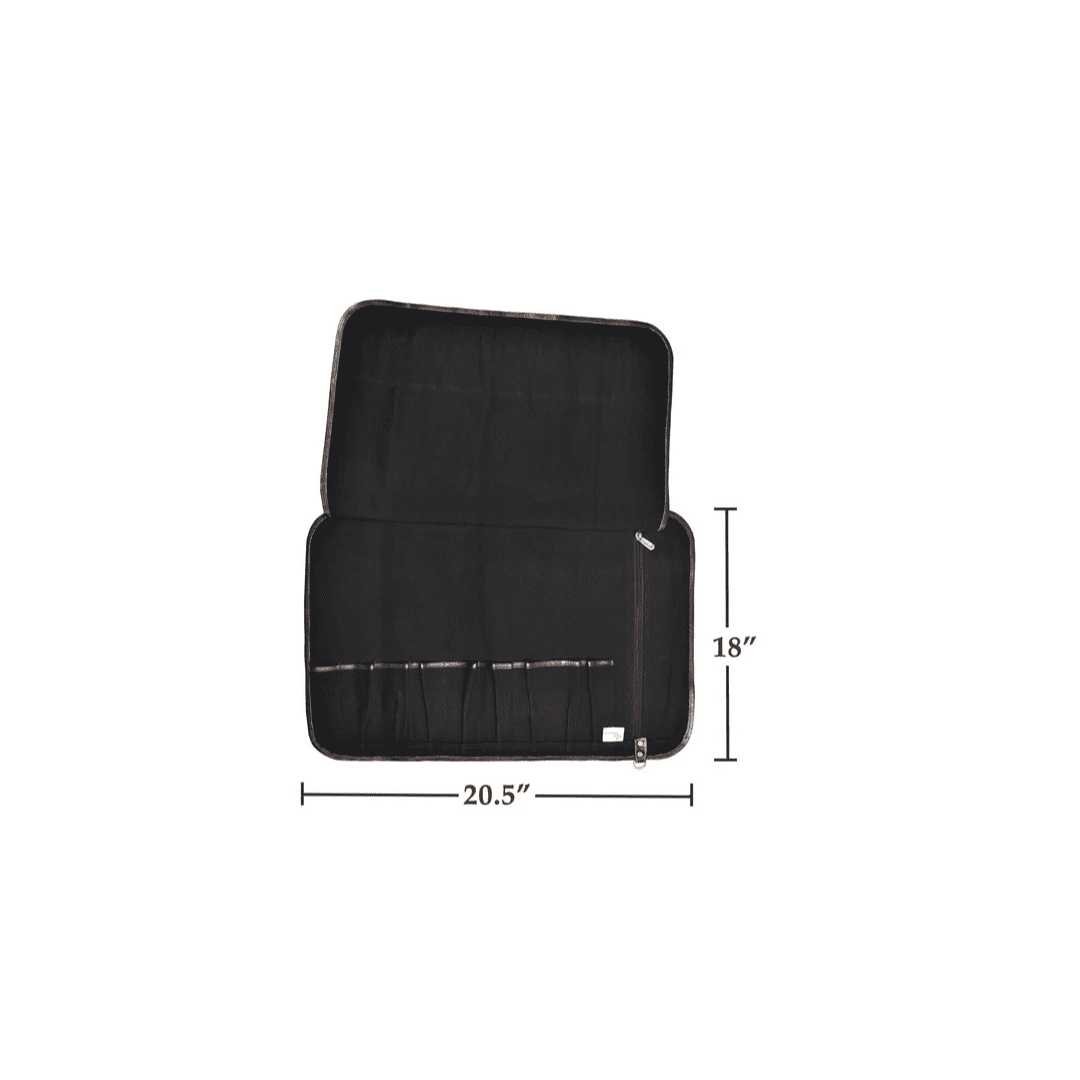 This slim knife bag has 9 slots for knives and tool and can hold a knife with an overall length of 15”(38 cm). When unrolled each knife bag has an overall dimension of 20.5” x 18” (52 cm x 46 cm).