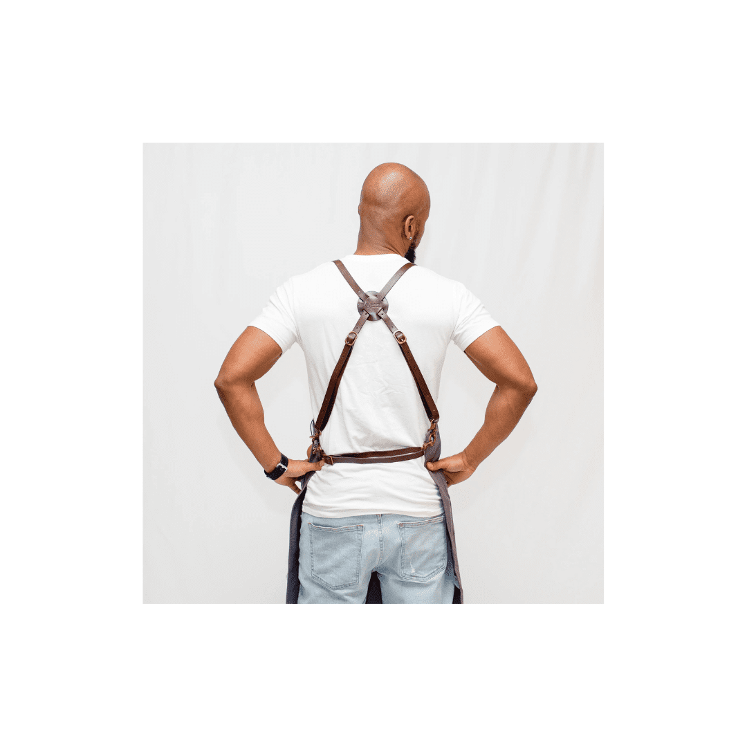 Our Leather Strap Aprons come with many accessible pockets, heavy-duty washed canvas, and brass hardware. All aprons come with our signature Cross Back design allocating the weight evenly across your shoulders, for a more comfortable fit.