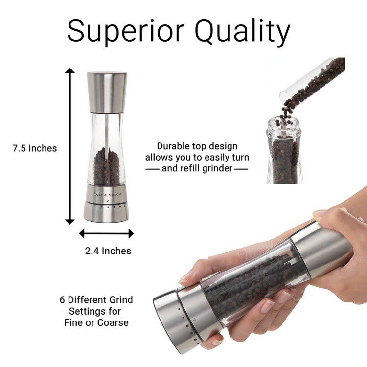 From fine powders to coarsely sliced and ground gourmet chunks, Derwent Pepper Mills use premium hardened carbon steel millworks to bring user-friendly spice control to your table with six distinct settings. Simply twist the collar on the Derwent Pepper Mill to 6 pre-selected settings to achieve a fine to coarse grind during and after cooking. Use a coarse grind for steaks, a medium setting for pizzas and a fine setting for soups and sauces. Each pepper mill features a push top cap for easy refilling. The grinding mechanism is guaranteed for life.