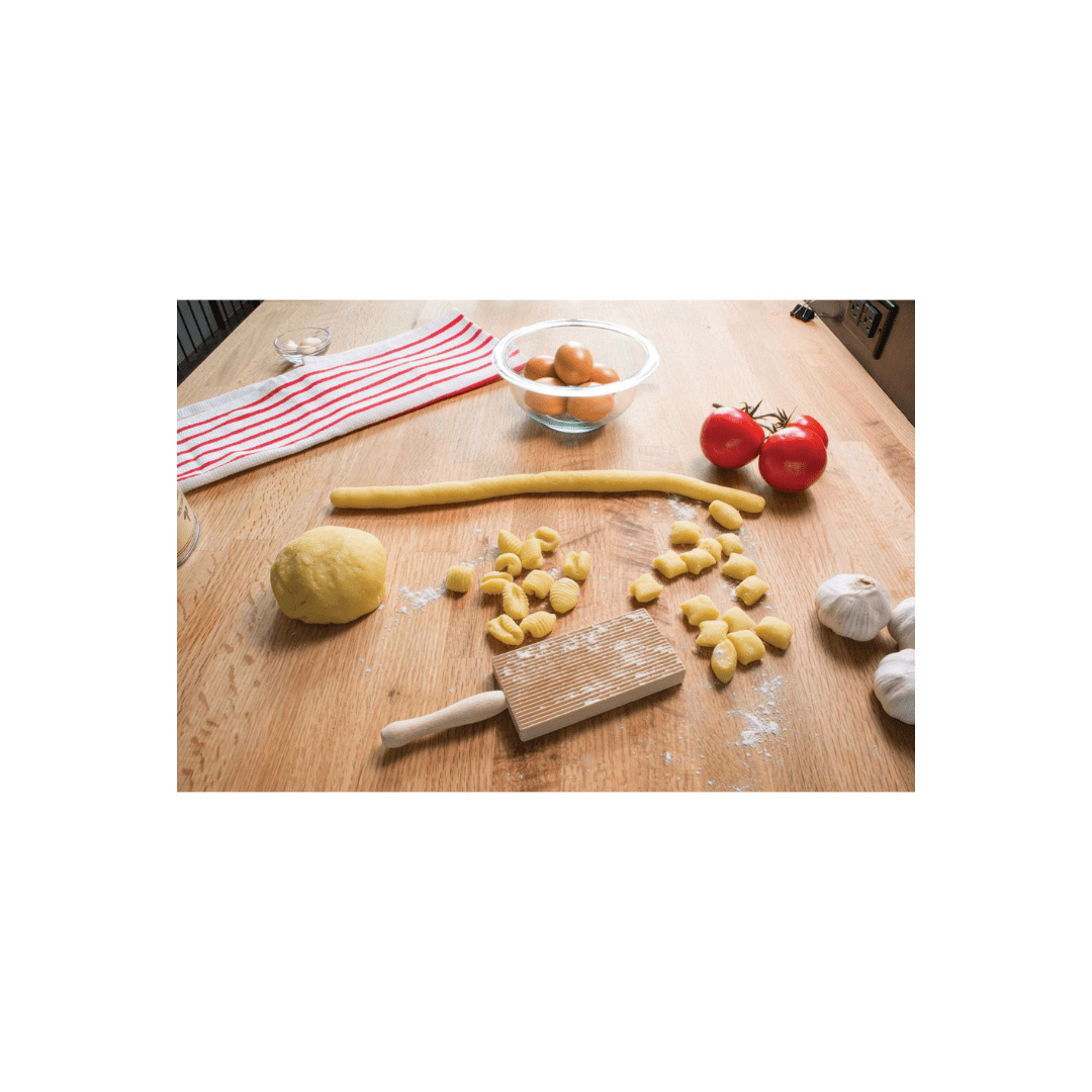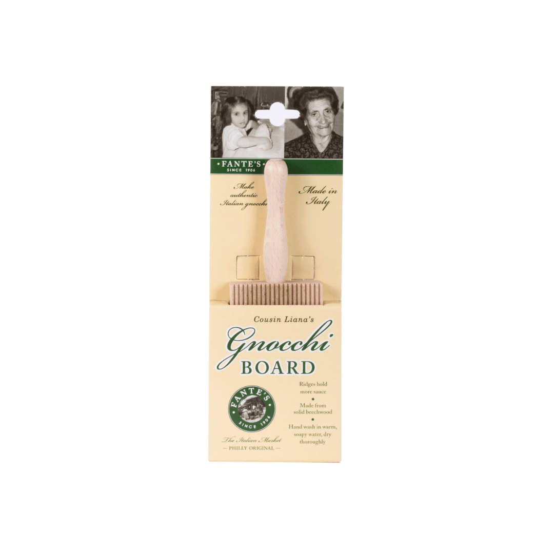 Fante’s Cousin Liana’s Gnocchi Board is perfect for making authentic gnocchi pasta. Gnocchi, literally meaning ‘lump,’ is a light and plump Italian dumpling made from a potato and semolina dough. Nothing tastes better than homemade pasta and learning how to make gnocchi couldn’t be easier. Cousin Liana’s rustic pasta maker brings old world charm and function to contemporary kitchen tools. Special ridges on the board form a more consistent shape than would using a fork, and add the traditional texture that holds more sauce without flattening the delicate dough. Similarly sized gnocchi cook more evenly and allow for a more attractive presentation. The easy-grip handle helps achieve, and maintain, the perfect angle and keeps it steady during use. Simple to use. Prepare dough according to the desired gnocchi recipe. Roll dough into long ropes, ¾-inch in diameter, then cut into individual squares, ¾-inch long. For best results, working each piece separately, place a square of dough onto the Gnocchi Board and press slightly to imprint it. Then, starting at the top of the pasta, roll it along the ridges with a gentle pressure to imprint the entire circumference. Dust the gnocchi with flour to prevent them from sticking and set aside until all dough is formed. Cousin Liana’s Gnocchi Board works nicely as a cavatelli maker, too! Made in Italy from all-natural beechwood. Easy to use and clean. Wipe with a dry cloth or brush before first use, and after every use.