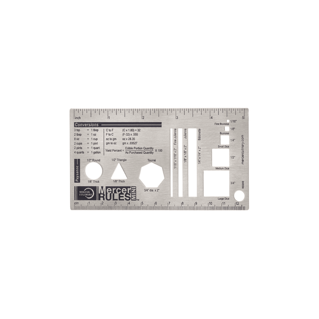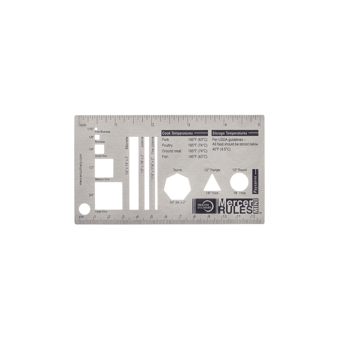 Durable stainless steel construction. Compact size to fit in chef coat pocket. Shows classic knife cuts. Handy reference tool full of resourceful information.