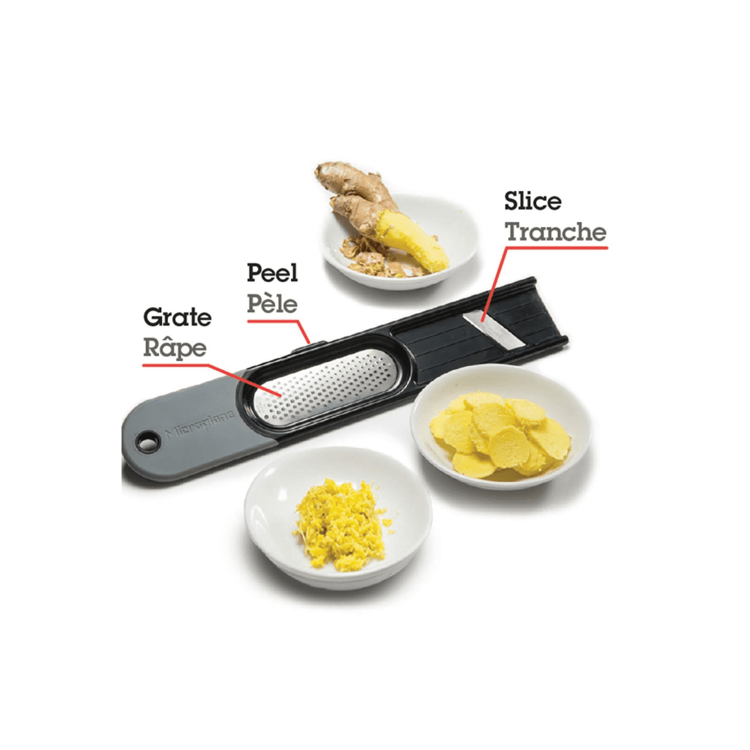 We love fresh ginger, but peeling, slicing, and grating ginger can be a chore. Not anymore! The Microplane 3-in-1 Ginger Cheese Grater Tool simplifies the task of prepping ginger! The non-slip base and handle allows for comfort and stability. You can hold the tool at an angle, or place it flat on a surface to slice or grate. The blades are made of stainless steel and are dishwasher safe!