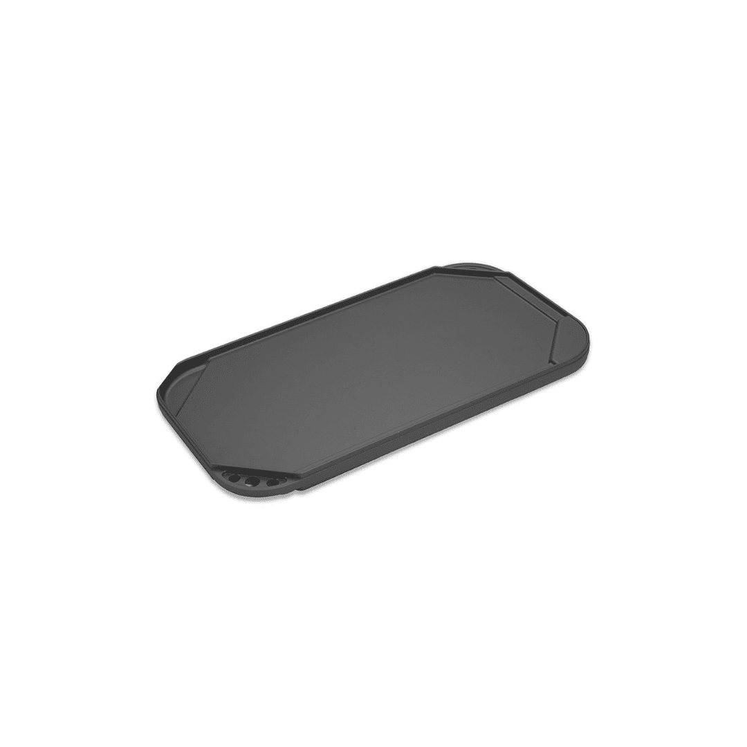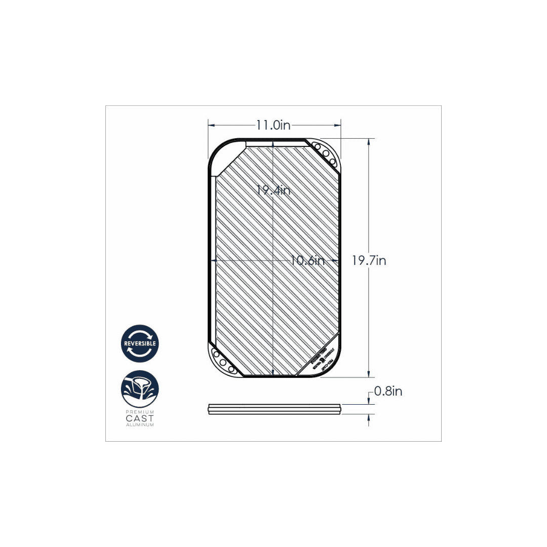 Spanning two burners, this large-capacity griddle features a two-sided design. A smooth side reverses to a ribbed grill side which sears flavorful grill marks into your foods as they cook. For cooks who live in small spaces and don’t own a grill, this offers a simple solution to achieve tasty grilled flavor indoors. Cast aluminum construction means this pan is hefty, but light enough to easily lift and maneuver in your kitchen, and will cook and brown foods very evenly across its surface. Made in USA.