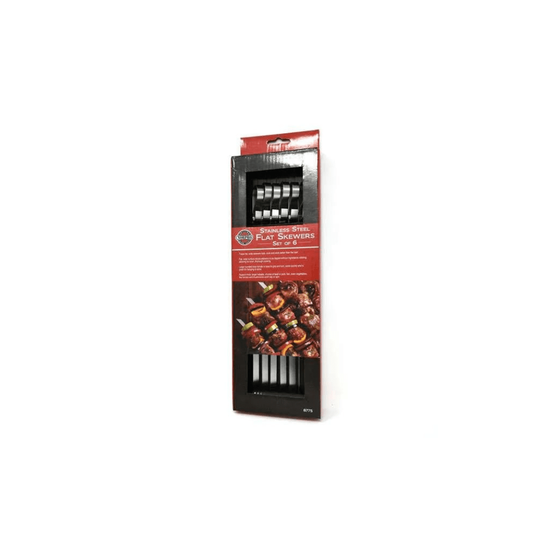 These flat, wide skewers look, cook and work better than the rest! The smooth metal surface makes it easy to slide food on and off. The flat, wide surface allows skewers to be flipped without ingredients rotating, allowing for even, thorough cooking.