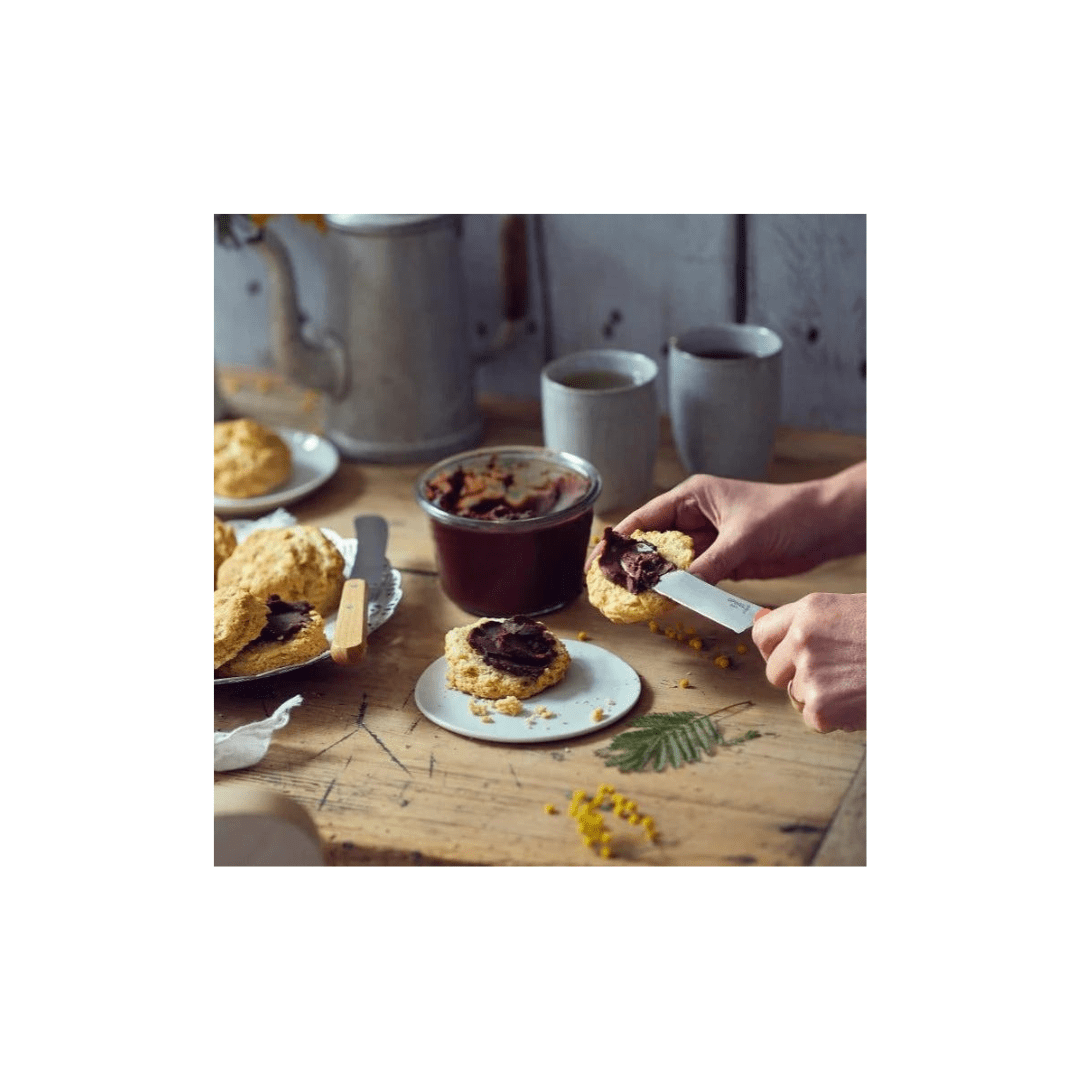Unique in its features, the Brunch Spreading knife has a 4.5-in. blade that is ideal for reaching the last bit of nutella in the bottom of a jar. A wide, rounded tip on the blade allows easy spreading of anything you can think of!