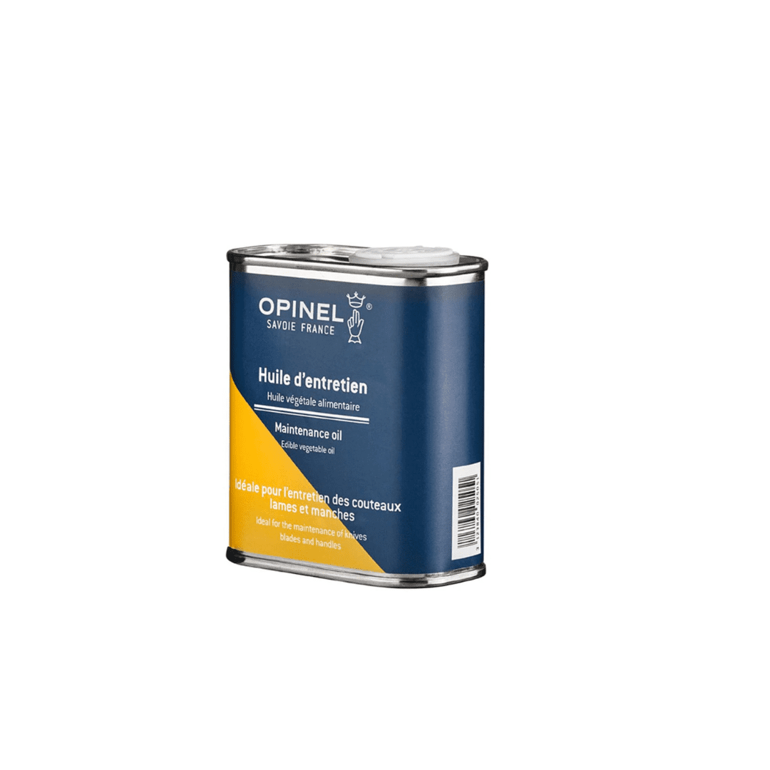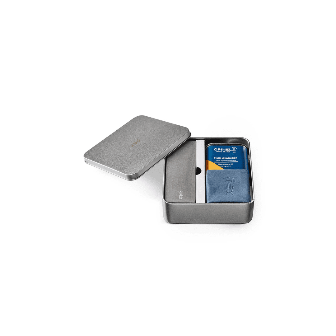 Nestled into a metal storage box, the Maintenance Kit contains a 5.5 inch sharpening stone, a 5oz can of plant-based oil, and a microfiber cloth all used in tandem to maintain and prolong the life of your Opinel knife.