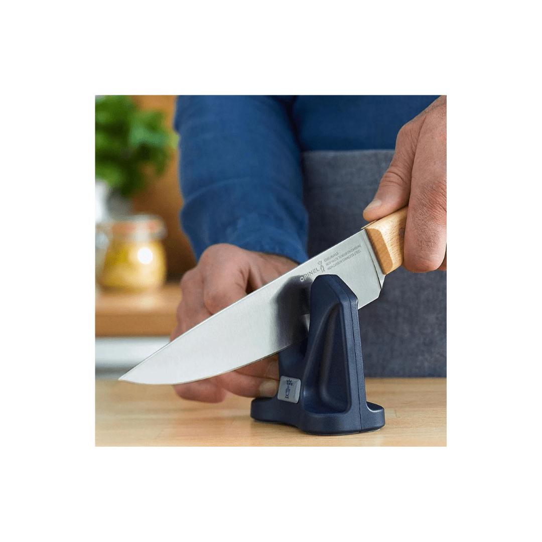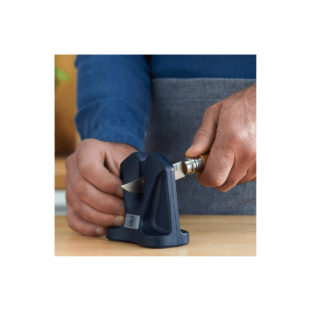 The self-adjusting angle provides a 15 degree bevel on each side of the blade and the silicone padded base holds it firmly in place while sharpening. It is quick and easy to use, allowing anyone to sharpen kitchen knives or pocket knives with one simple, easy-to-master motion.