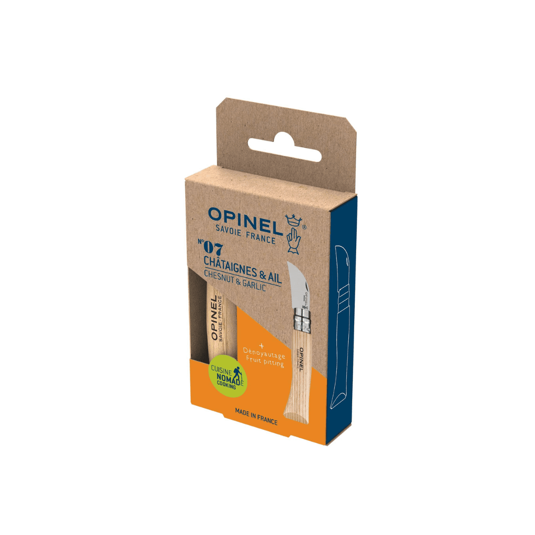 The N°07 Chestnut Knife joins the specialty folding knives and is the latest addition to Opinel Gourmet collection. Use it all year round to score and peel chestnuts, remove fruit pits and to peel garlic cloves. Pack this knife for your next foraging hunt in the woods, it’s compact, lightweight and efficient.
