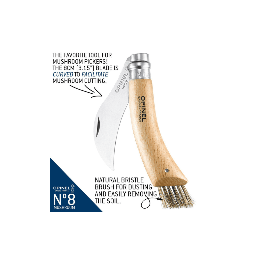 The N°08 Mushroom Knife features a curved blade to help cut delicate mushrooms, and a boars hair brush on the end to help wipe away any dust or debris. Perfect for foraging mushrooms including morels, chantrelles, porcinis, oyster mushrooms and more!