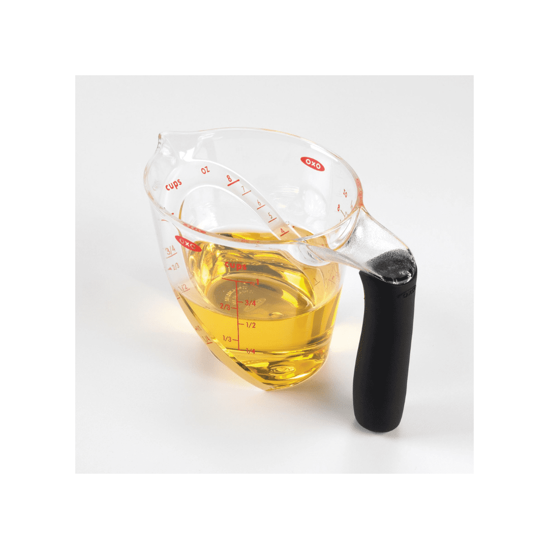 Good Grips OXO has revolutionized liquid measuring with the GOOD GRIPS Angled Measuring Cups. A patented angled surface lets you read measurement markings by looking straight down into the Cup and eliminates the need to fill, check and adjust the amount of liquid you are measuring. The handle is soft and non-slip for a firm grip. The bright measurement markings in convenient cup, ounce and milliliter denominations accommodate any recipe.