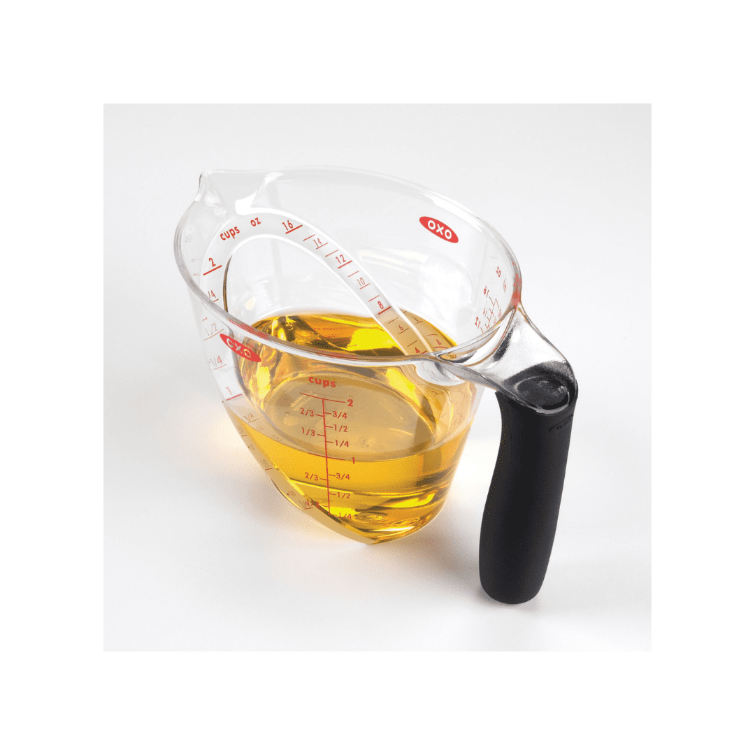 Good Grips OXO has revolutionized liquid measuring with the GOOD GRIPS Angled Measuring Cups. A patented angled surface lets you read measurement markings by looking straight down into the Cup and eliminates the need to fill, check and adjust the amount of liquid you are measuring. The handle is soft and non-slip for a firm grip. The bright measurement markings in convenient cup, ounce and milliliter denominations accommodate any recipe.