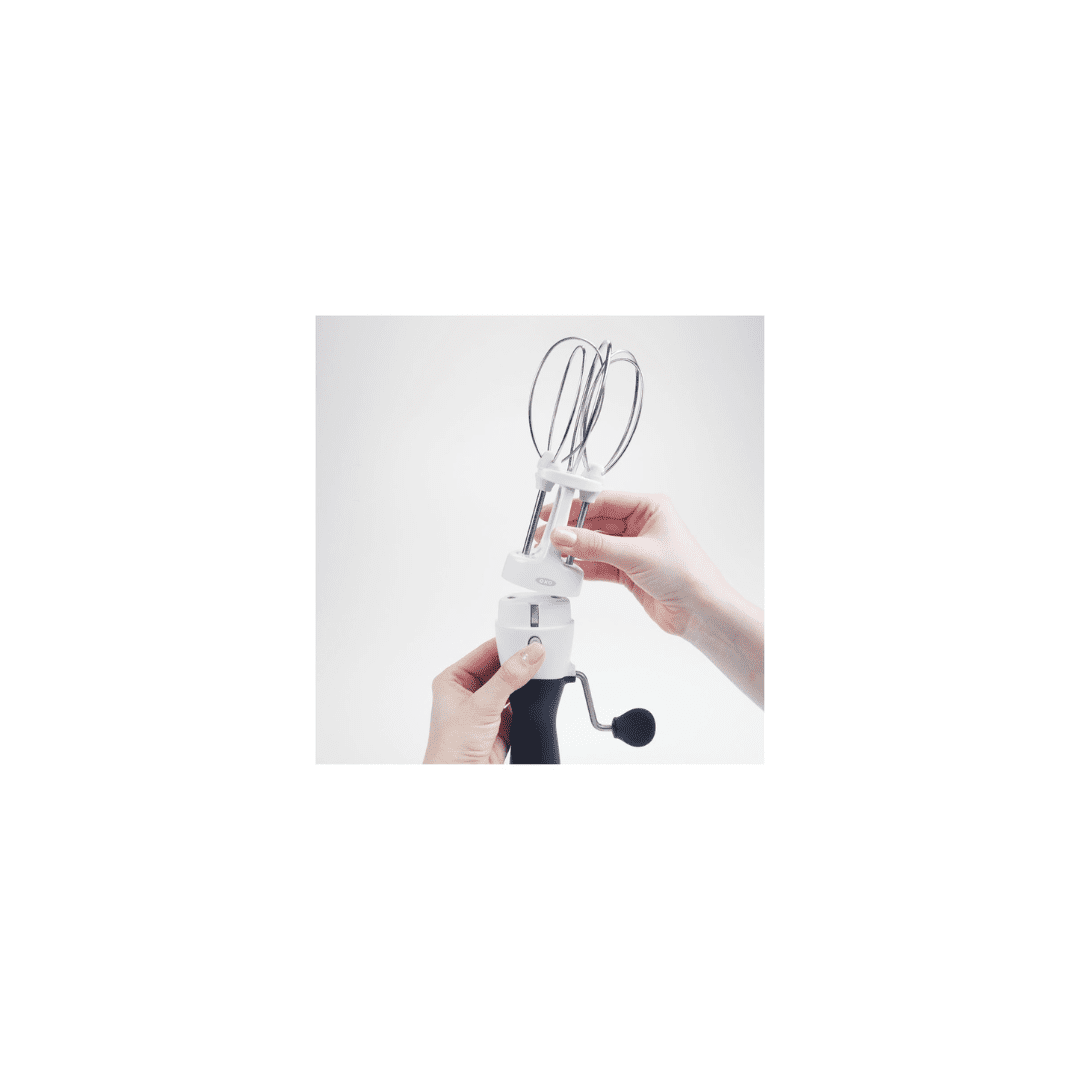 Designed to reduce arm strain, it churns even while resting on bottom of bowl. Dishwasher-safe base detaches easily by pressing two side buttons, and beaters can be removed for easy cleaning.