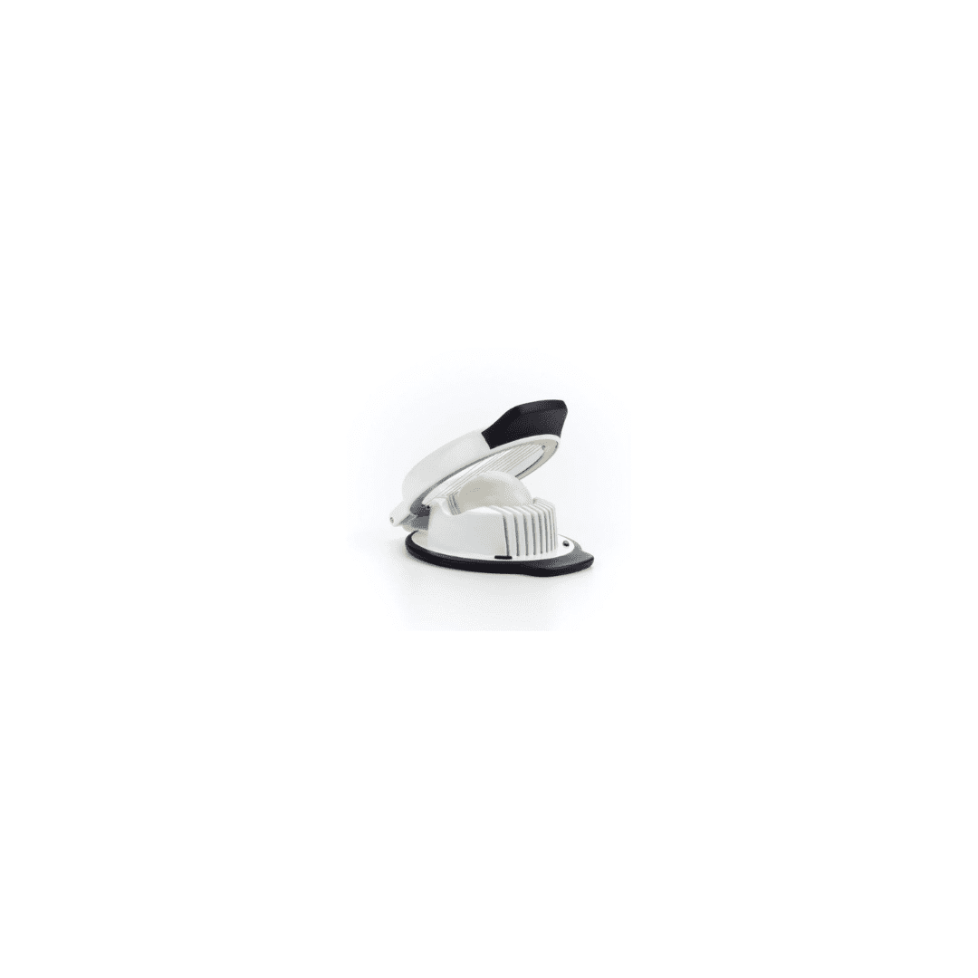 The OXO Good Grips Egg Slicer yields perfect 5 mm slices with one simple press. The holder cradles the egg in two directions, giving you the option of round or oblong slices. The raised handle is easy to open and close, and the non-slip base provides a comfortable grip while slicing over bowls or plates.