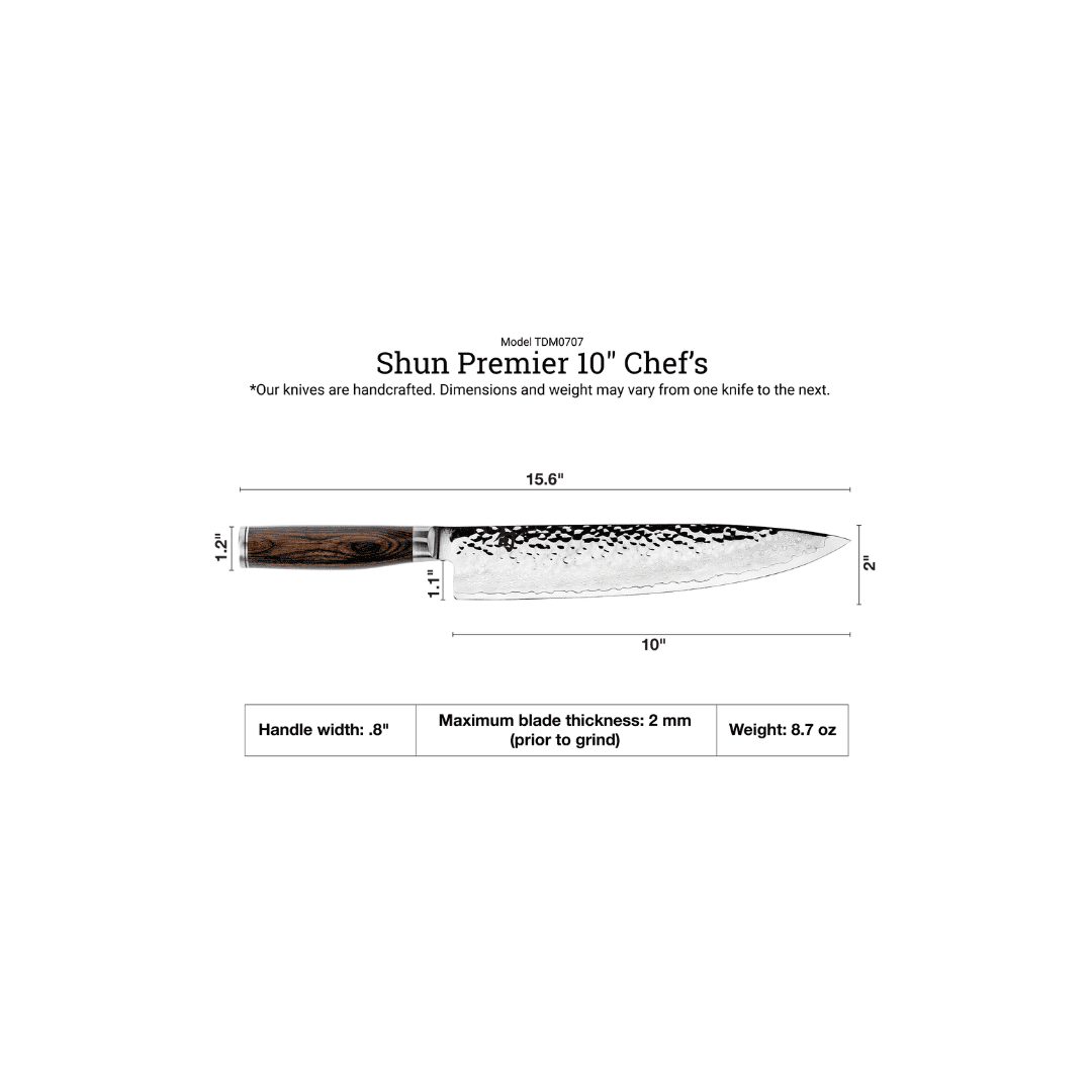 Each blade in the Shun Premier line has a cutting core of Shun’s proprietary VG-MAX “super steel” to take and hold a precision edge.