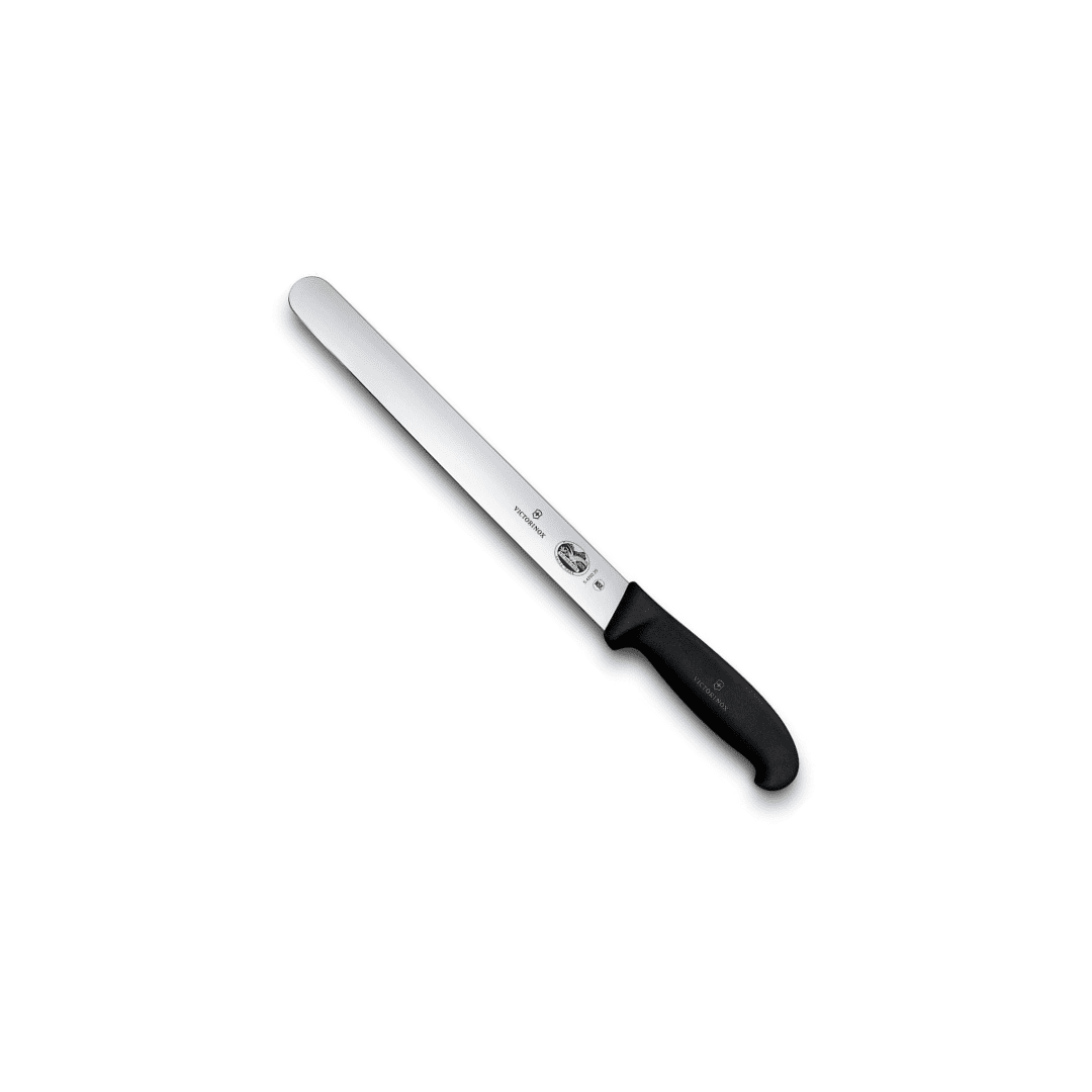 With the Victorinox 40542 Slicer/Carving knife it’s easy to carve perfect, precise cuts of ham, pork, fish, beef, and much more. Longer and narrower than common carving knives, the slicing knife is an excellent choice for long, smooth strokes and can make quick work of larger portions of product. The stamped construction incorporated in the making of this knife make for a much thinner, lighter blade. The handle is made of patented, slip-resistant black Fibrox and can help even the most inexperienced kitchen staff steer clear of unwanted cuts caused by inferior handles. The simple 10 inch straight blade is great for rocking the knife back and forth for a smoother, more precise slice than a serrated blade. Top that off with a guaranteed lifetime warranty and you simply can’t go wrong with the Victorinox 40542 Slicer!